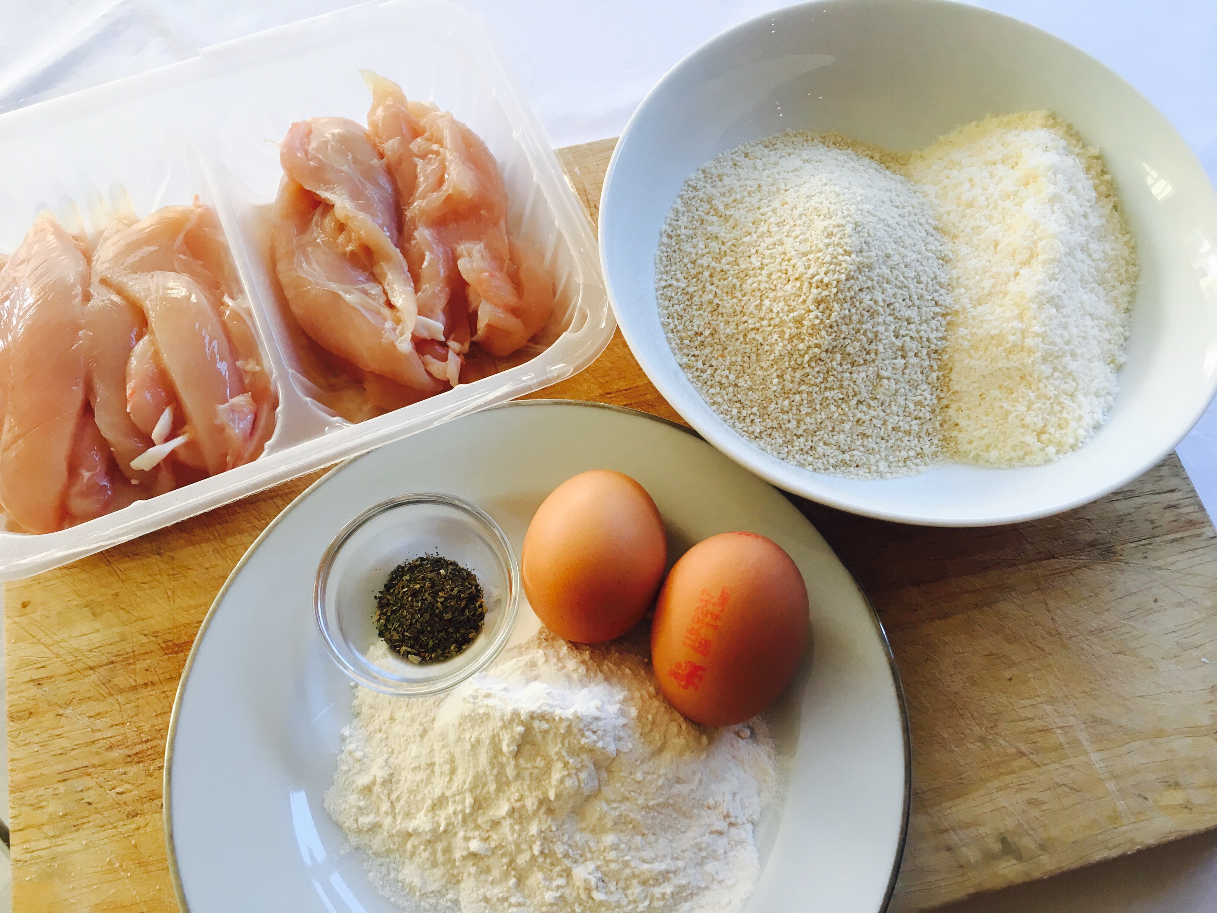 - Now, place your plates in order with a clean plate / platter at the end of the line so that you have somewhere to place your breaded chicken fillets…