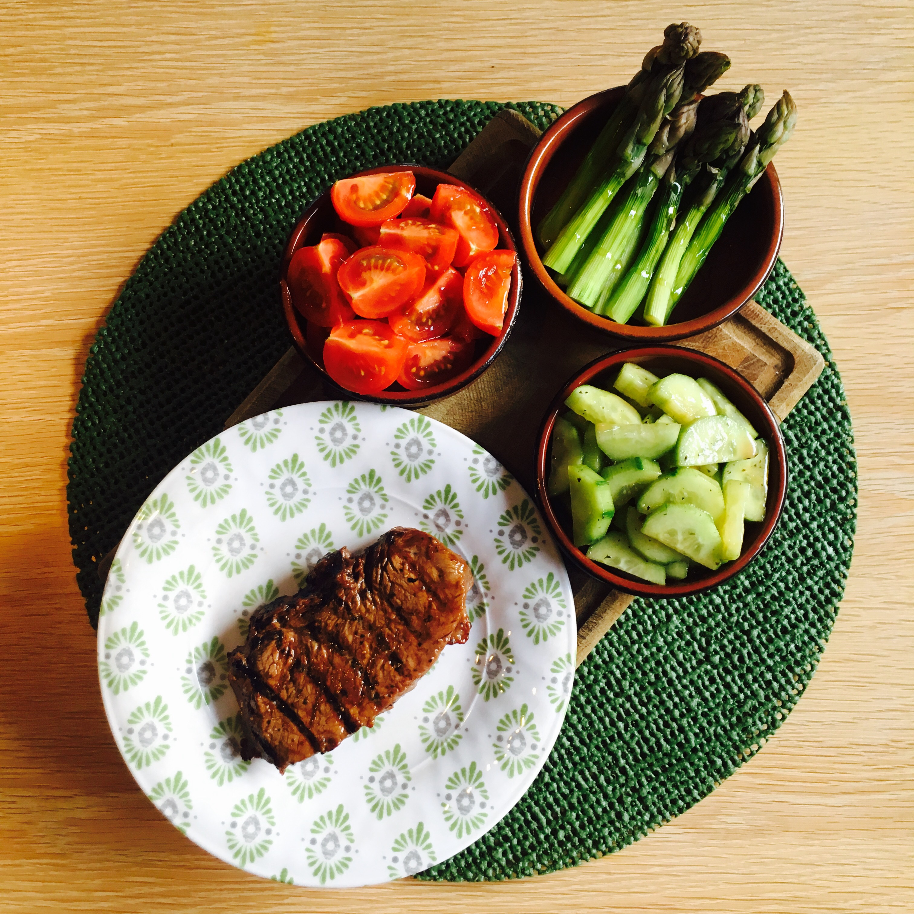 Cook your steaks to your liking on a braai / barbecue or in a griddle pan. Serve with salad, veg and chips. See my very simple tomato salad “recipe”, it’s a winner.