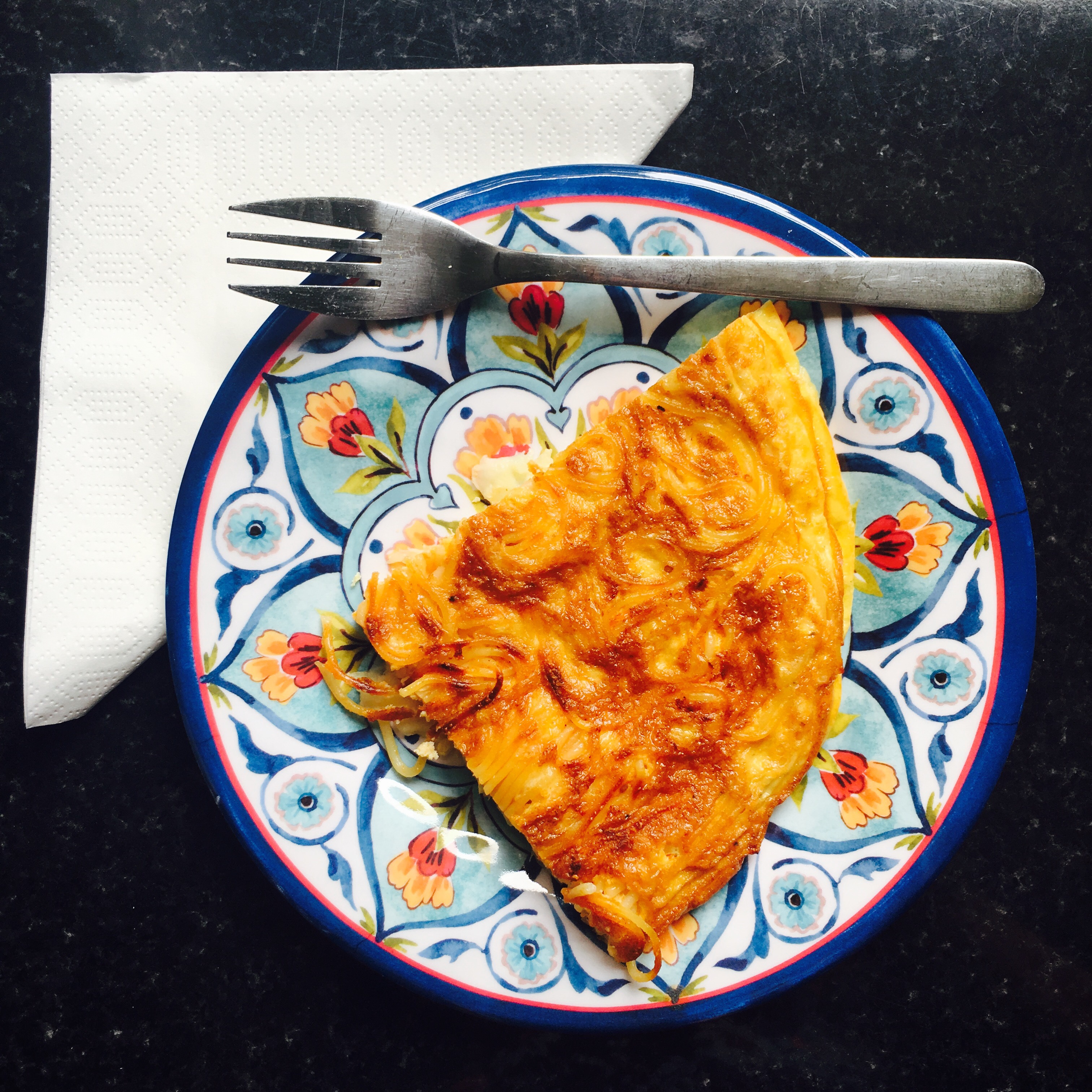 - Add the left over pasta and spread out in the frying pan, put on the lowest heat and leave for about 5 – 10 minutes