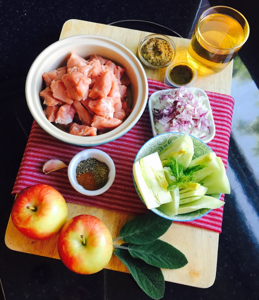- Add the meat back into the pot with the apple, fennel, mustard, cider and stock bring to the boil then reduce the heat to a simmer and leave with the lid off for an hour until thickened, stir occasionally (you can also add baby potatoes, peeled and cut into quarters if you would like to bulk this up a bit, add 6 – 10 depending on their size)