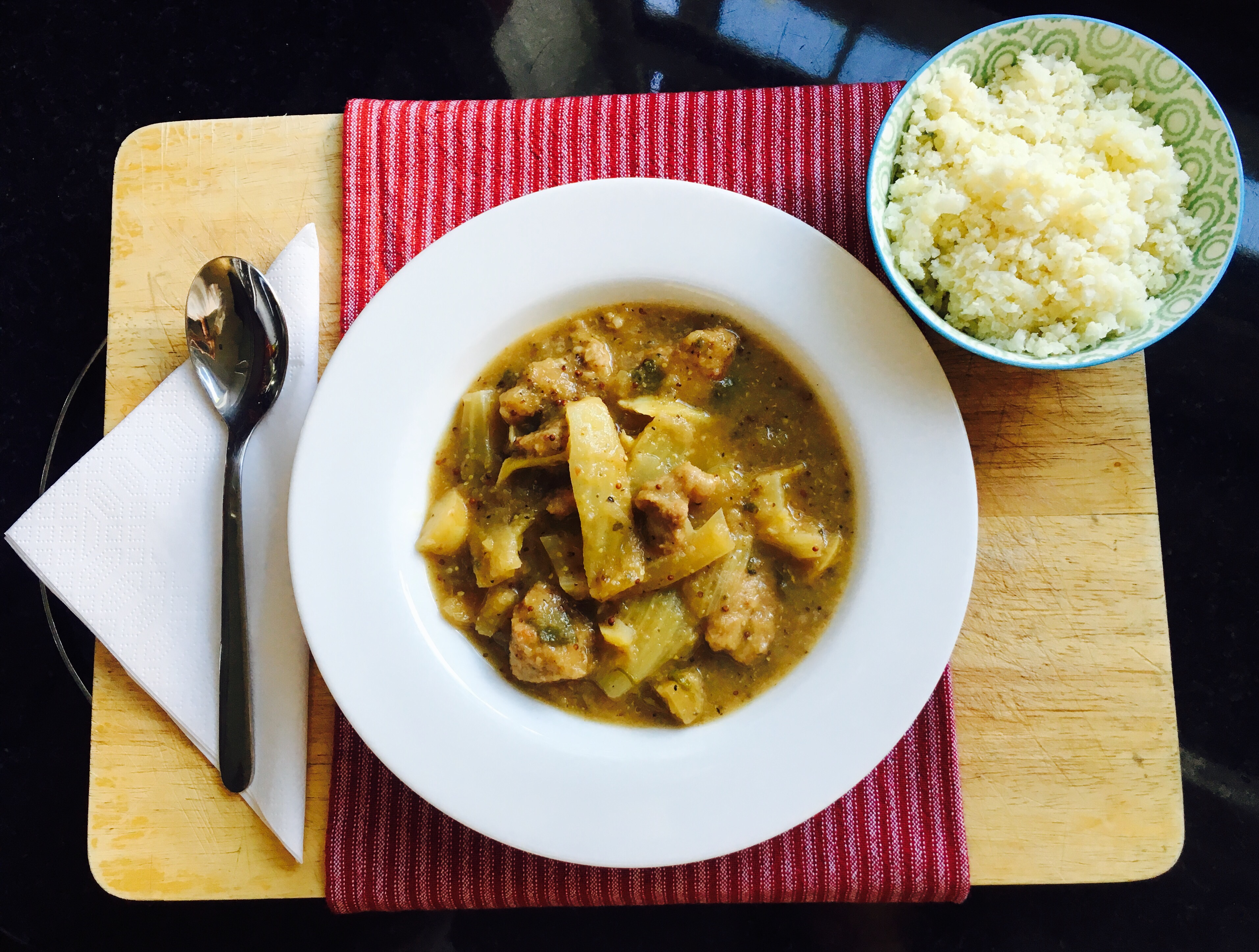 Serve with mashed potato or as we usually do, with pasta. On this occasion we’re having cauliflower rice.