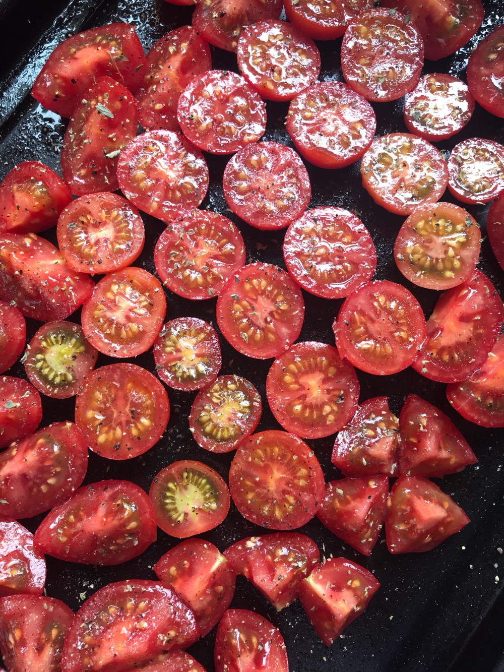 - Cut the tomatoes in half and sit them cut side up on a greased baking tray or oven proof dish
